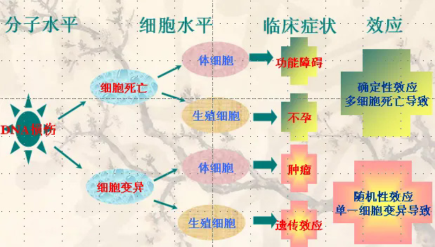 1.隨機性效應(yīng):無劑量閾值有害效應(yīng)的嚴重程度與受照劑量大小無關(guān),任何微小的劑量也可引起效應(yīng),只是發(fā)生的幾率極其微小而已。如:致癌效應(yīng)(癌癥 、白血?。?; 遺傳效應(yīng)(損傷發(fā)生在具有遺傳信息的功能細胞上,發(fā)生的效應(yīng)將顯現(xiàn)在受照者的后代身上)。