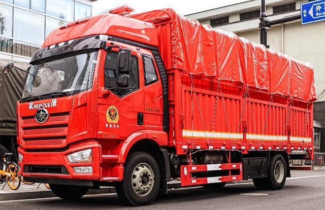 物資運(yùn)輸車(chē)有各種各樣的車(chē)型品牌,有東風(fēng)天錦、重汽、陜汽等。6米8, 高頂雙臥,18噸總質(zhì)量,花籃車(chē)廂,解放這代中卡風(fēng)格獨(dú)到,立體感很足。高頂雙臥駕駛室,適合多位駕駛員輪班。如果遇到跨地區(qū)長(zhǎng)距離增援,這輛車(chē)可以?xún)蓚€(gè)駕駛員輪班,屬于先天性的優(yōu)勢(shì)了。260馬力的大柴CA6DK1-26E6國(guó)六發(fā)動(dòng)機(jī),排量7.2升,260馬力,1000N.m的扭矩,各方面表現(xiàn)都非常優(yōu)秀。物資運(yùn)輸車(chē)匹配的應(yīng)該是解放的8擋手動(dòng)變速箱。前橋采用了解放最新的F4N-1900中卡橋,載重量5.5噸級(jí)別,后橋則是解放的378橋,速比有多種可選,前后橋均采用了十孔螺栓結(jié)構(gòu),并且搭配了275/80R22.5的輪胎,整車(chē)也采用了板簧懸架。左側(cè)車(chē)架甚至連經(jīng)典的器材箱都完好保留,除此之外,鋁合金氣瓶、解放的氣驅(qū)尿素和空濾看得一清二楚。油箱位于車(chē)架右側(cè),鋁合金油箱容積400升。物資運(yùn)輸車(chē)整車(chē)基本沒(méi)有針對(duì)消防做特殊化改裝,除欄板高度較高。物資運(yùn)輸車(chē)食品、器材等基本上絕大部分物資的運(yùn)輸,既可以尾開(kāi)門(mén)卸貨,也可以側(cè)開(kāi)門(mén)卸貨。