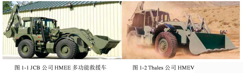 當(dāng)今世界范圍內(nèi),英美日澳等發(fā)達(dá)國家研制的多功能緊急救援車處于業(yè)內(nèi)較為領(lǐng)先的地位,其中較為典型的如圖1所示英國JCB公司為美軍設(shè)計(jì)開發(fā)的HMEE(High Mobility Engineer Excavator),是一種高機(jī)動多功能挖掘機(jī),該機(jī)型一般用于戰(zhàn)場挖掘任務(wù)和戰(zhàn)場救援,能夠配備液壓錘、鏟斗、挖斗等作業(yè)工具,底盤系統(tǒng)采用多模式空氣懸掛系統(tǒng),可保證高速行駛平順性和正常作業(yè);采用全輪驅(qū)動能夠應(yīng)對各種復(fù)雜地形,具有全輪轉(zhuǎn)向/蟹行轉(zhuǎn)向功能,為避免車輛喪失機(jī)動性,車輛利用高強(qiáng)度輪胎,能在面積狹小的場合實(shí)施作業(yè),能夠由飛機(jī)進(jìn)行遠(yuǎn)距離運(yùn)輸以實(shí)現(xiàn)快速移動。另外,澳大利亞 Thales 公司為美軍設(shè)計(jì)的 HMEV(High Mobility Engineering vehicle)與 HMEE 相類似,如圖 2 所示,同為較典型的高機(jī)動多功能緊急救援車。
