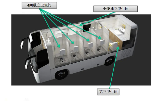 各類大型會展、賽事、文娛活動保障往往有突發(fā)較大的如廁需求。后勤保障車整車長12米,寬2.55米,高3.6米,內(nèi)高大于等于1.9米。司機區(qū)域獨立,有兩個座位,配備獨立空調(diào)。是真空型環(huán)保廁所是用于人員大小便的專用作業(yè)車。搭載馬桶、蹲便器、洗手池等專用裝備,既相互獨立,又互相關(guān)聯(lián)??商峁?人同時入廁使用。利用真空將便器內(nèi)的污物抽吸到真空泵,經(jīng)粉碎后,再將污物輸送到污物箱,同時吸附異味,使整個廁所干凈、整潔、移動方便。滿足多人如廁的需求,且無需外接水電,方便現(xiàn)場保潔。精準(zhǔn)到位,快速保障,有效降低了人力和時間成本,提高了使用效率。取消原車風(fēng)道,降低平地板,增加了原有使用空間,整車根據(jù)不同功能需求分區(qū)布局,充分采用新技術(shù),滿足人們對生活品質(zhì)的追求;節(jié)約資源,轉(zhuǎn)場效率高。滿足人們的如廁需求。大大節(jié)省了傳統(tǒng)廁所建設(shè)的人力、物力財力。