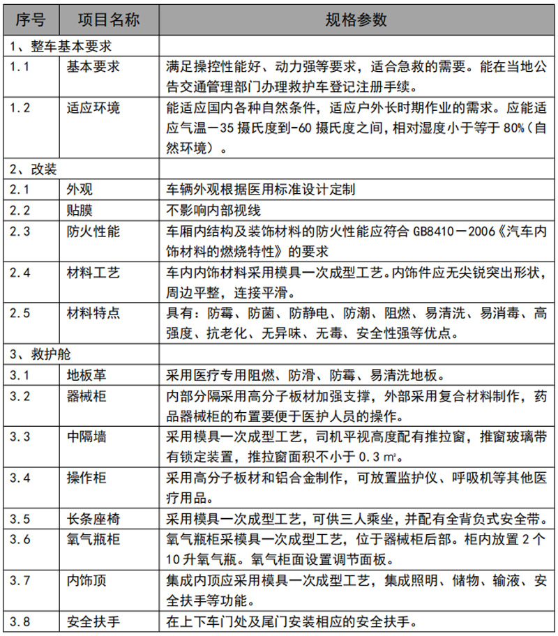滿足操控性能好、動(dòng)力強(qiáng)等要求,適合急救的需要。能在當(dāng)?shù)毓娼煌ü芾聿块T辦理救護(hù)車登記注冊(cè)手續(xù)。可以使用各種自然環(huán)境使用,戶外作業(yè)也不在話下。零下35度到60度都適應(yīng),小于80%濕度環(huán)境。符合GB8410- 2006 《汽車內(nèi)飾材料的燃燒特性》的要求。內(nèi)部分隔采用高分子板材加強(qiáng)支撐,外部采用復(fù)合材料制作,藥品器械柜的布置要便于醫(yī)護(hù)人員的操作。采用集成電路控制系統(tǒng),觸摸屏操作,可顯示日期,時(shí)間,溫度,濕度,時(shí)時(shí)監(jiān)控電池電壓,交流電壓,消毒燈開關(guān)及消毒時(shí)間的自動(dòng)控制,排風(fēng)及進(jìn)風(fēng)控制,吸引器的控制,逆變器控制,照明燈控制。