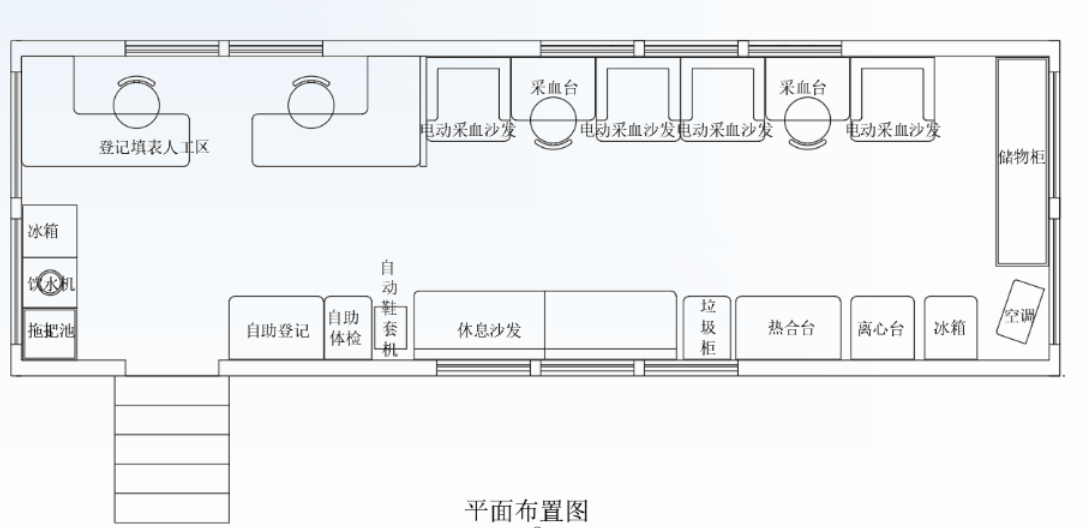 獻(xiàn)血屋由骨架、外蒙鋼板、隔溫層、鋁塑板、中空鋼化玻璃窗、防盜門、底盤、外墻、內(nèi)部裝修、醫(yī)療設(shè)備等結(jié)構(gòu)組成。面積比較大,內(nèi)部設(shè)置嚴(yán)格按照采血流程要求,包括獻(xiàn)血征詢區(qū)、體檢區(qū)、快速檢測(cè)區(qū)、獻(xiàn)血等候區(qū)、采血區(qū)、和休息區(qū)。配備的設(shè)備滿足血液儲(chǔ)存,試劑儲(chǔ)存,電子血壓計(jì),血紅蛋白儀,細(xì)胞分離機(jī)等醫(yī)療廢物存放設(shè)施,獻(xiàn)血者可在休息區(qū)觀看電視節(jié)目和進(jìn)行娛樂活動(dòng),是一所現(xiàn)代化的愛心獻(xiàn)血屋。