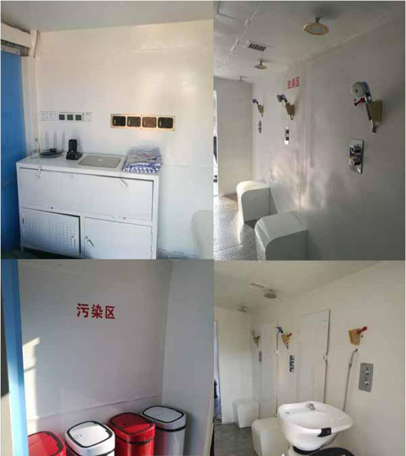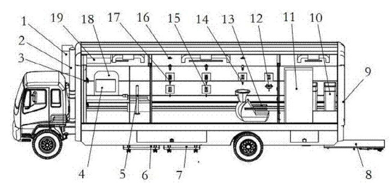 5. 核化污染洗消車潔凈區(qū)包括全身紅外烘干設(shè)備、座椅、毛巾柜、衣柜和控制臺并設(shè)置有照明、空調(diào)和新風(fēng)系統(tǒng)。本發(fā)明的積極效果在于:移動展開迅速,可快速抵達(dá)突發(fā)事件現(xiàn)場開展被污染人員洗消;不僅自帶水箱和洗消液箱,功能齊全,布局合理,還可外接水源供水,并可實時補(bǔ)充洗消液,自帶的水箱和洗消液可滿足125 人次去污洗消具有操作方便、行動快捷、自動化程度高,符合國際醫(yī)學(xué)救援規(guī)范和國家標(biāo)準(zhǔn),符合核化污染人員去污洗消流程和規(guī)范;滿足應(yīng)急救援快速需求,洗消車范圍設(shè)計制造,功能齊全,配備有車輛實時衛(wèi)星定位、.洗消后放射性水平檢測、核素識別功能,功能全;內(nèi)外光潔、不易沾染、便于去污、可重復(fù)多次使用;.它不僅可以快速抵達(dá)核化突發(fā)事件現(xiàn)場開展被核化污染人員的現(xiàn)場去污洗消,又可停放在核化損傷救治基地和定點醫(yī)院作為二次洗消用房。是核化突發(fā)事件放射性物質(zhì)或化學(xué)物質(zhì)污染人員去污洗消必配裝備。