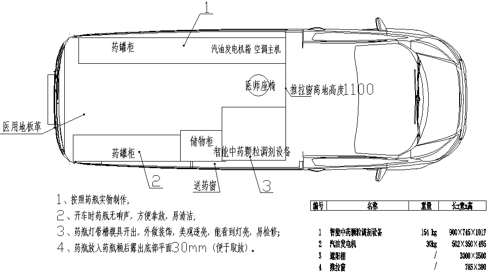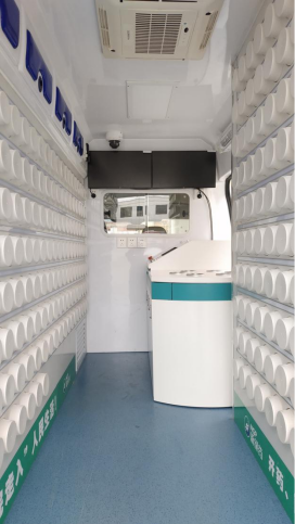 移動中藥房車車廂頂部安裝LED滾動屏,顯示接口與發(fā)藥設(shè)備對接,顯示所發(fā)藥品名稱。頂部還安裝紫外燈以便對整個(gè)車廂進(jìn)行殺菌。車輛有GPS,車內(nèi)提供5G(含4G)網(wǎng)絡(luò)連接。配置了駐車空調(diào)和行車空調(diào),以便停車熄火時(shí)為車廂內(nèi)提供溫濕度調(diào)節(jié)。