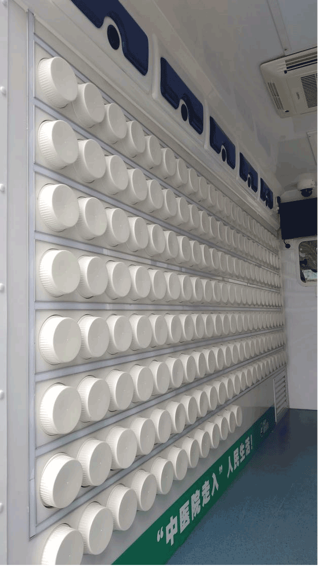 該款移動中藥房車可搭載麻黃、細(xì)辛、生姜、葛根、菊花、丹皮、青蒿、生地等上百種中藥,車內(nèi)即可實(shí)現(xiàn)快速智能配藥。當(dāng)配藥醫(yī)護(hù)拿到藥方,找到所需要中藥,放入自動發(fā)藥機(jī)中,數(shù)分鐘就可以完成藥物發(fā)放。